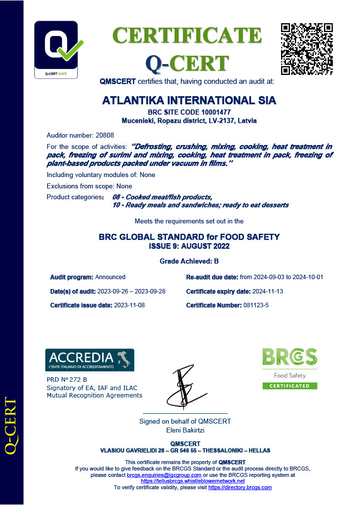 „Atlantika International” Ltd. odziedziczyła zakład, zespół profesjonalistów i wiele lat doświadczenia. Zakład został całkowicie odnowiony w 2018 roku, aby spełniać najwyższe standardy UE i zapewnić nieskazitelną jakość produktów. Fabryka jest wyposażona w japońskie linie produkcyjne surimi, pakowarki Multivac oraz wiele innych nowoczesnych technologii. Obecnie Atlantika produkuje szeroki zakres mrożonych i chłodzonych produktów surimi oraz hummus. Naszym najnowszym osiągnięciem jest certyfikacja BRC w czerwcu 2021 roku, otwierająca przed nami nowe horyzonty, nowe możliwości i nowy rozdział w historii Atlantiki…